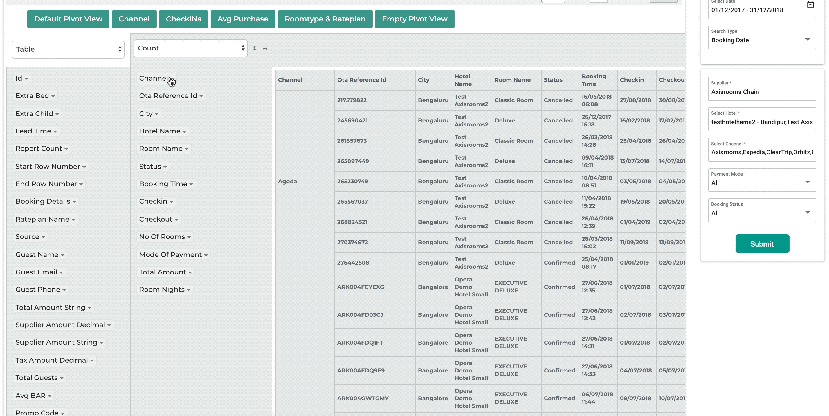 The fields are (Channel, OTA Reference ID, Status, Hotel Name, City, Room Name, Booking Time, Check In, Check Out, No.of rooms, Mode of Payment, Total Amount). These will display by default for every booking information in the dashboard. There are additional fields also present.